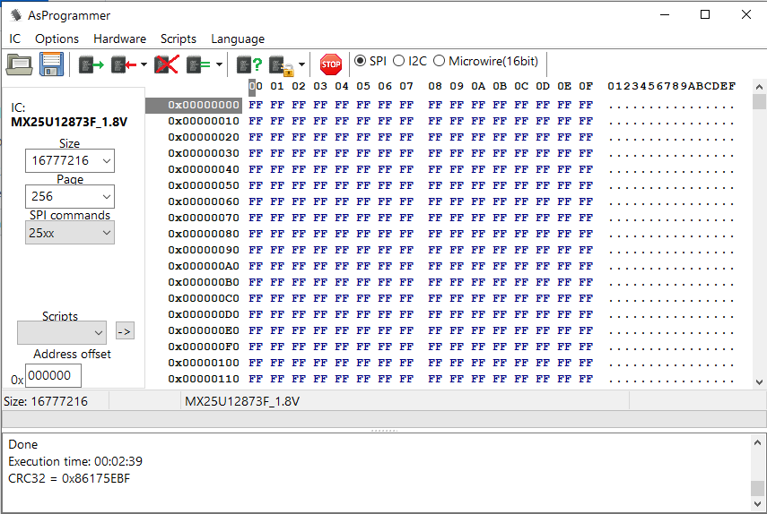 Die meisten Flashprogramme akzeptieren nur Dateien mit der Endung „*.rom, *.bin und *.hex“. Deshalb bekommt die Ausgabedatei die Endung „.rom“. Vor dem Flashen den SPI IC (Bios Chip) identifizieren und im Datenblatt nachsehen ob der IC eine Spannung von 1,8 V oder 3,3 V benötigt. Entsprechende den mitgelieferten 1,8 Volt Adapter nutzen oder nicht. Standardmäßig liegen bei dem CH341A Programmer 3,3 Volt an. Jetzt kann folgendermaßen vorgegangen werden: